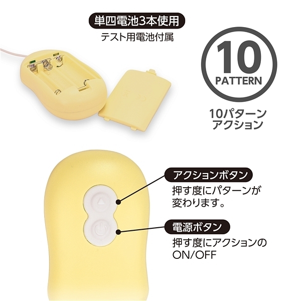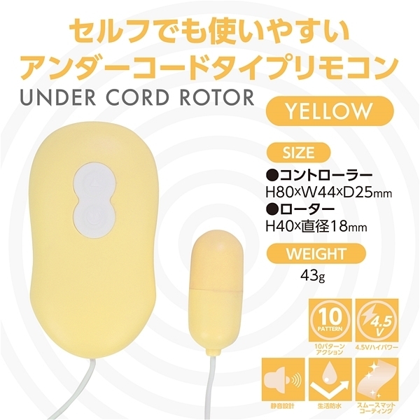 コントローラーの下側からコードが出ているためセルフプレイ時も通常時もコードの煩わしさが軽減されたスタイリッシュデザインのローターです♪握れば分かる使いやすさがウリで、他にはない使いやすさを重視したアンダーコードスタイルが特徴!単四電池3本を使用した4.5Vの強力振動マイクロモーターが搭載されていて、小径ローターで可愛いカラーバリエーション、さらにはマット加工を施すことで上質感を極めた新型ローターです♪10パターンの振動を備え、ハイパワーの4.5V仕様!生活防水仕様なのでローター本体の水洗いもできてローター部分はマット加工だから当て心地も良好♪10パターンアクションをワンプッシュで簡単にONOFF操作が可能です。パステル系で4種類のカラーバリエーションでこちらはイエローになります。