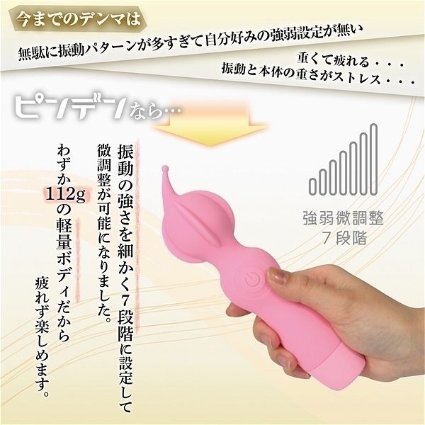 ピンポイントヘッド・ヒダ突起付の完全防水シリコンデンマです。上質振動の強力モーター搭載・高品質シリコンボディ・フレキシブルネックの上級性能に加えてピンポイントを強力刺激出来る先端突起と割れ目に入れて楽しめるヒダ突起形状をプラスしました。振動も一般的なパターン振動では無く、こだわりの強弱微調整可能な7段階振動です。もちろん普通のデンマスタイルも可能なので色々な楽しみ方が出来ます。しかもIPX7の完全防水性能だから使い勝手もバツグンです。90分満充電で60分使用可能(使用環境により大幅に増減します)なリチウムイオン電池内蔵。パワフルなのに繊細な使い方も楽しめるデンマです。●カラー:ブラック