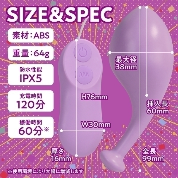 本体サイズ:コントローラー:3.0×7.6×1.6cm ローター:全長9.9cm×挿入長6.0cm 最大径3.8cm 重量:64g USB充電ケーブル USB充電式