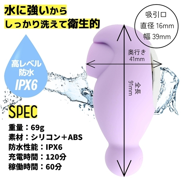吸引と振動のダブル刺激を同時に楽しめるコンパクトグッズです♪吸引口上部にマイクロモーターを搭載し、吸われながらブルブルとした振動が心地よい刺激を演出!吸引は強弱3段階と4種類のリズムパターン、振動は5段階の強弱調整と7つのリズムパターンを搭載しています♪それぞれを自由に組み合わせて、自分好みのパターンを楽しめます!吸引口は直径16mm設計で真空刺激がしっかり伝わる仕様です♪本体は全長10cm以下のコンパクト設計、重さもわずか69gで持ちやすく手が疲れにくいのも魅力!(使用環境により使用時間は変動します!)静音設計+IPX6相当の防水仕様で、使用後もしっかり洗えて清潔に保てます♪肌ざわりの良いシリコンボディで快適な使い心地を追求しました!