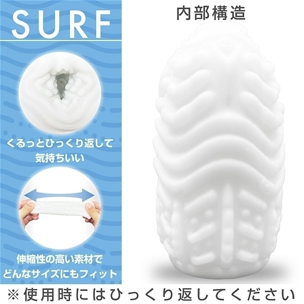 コンパクトでも実用的で繰り返し使えるミニホール。波うつ太ひだが全体を優しく擦り上げる。コンパクトで持ち歩きに便利なミニホール。SURFは波うつ太ヒダが全体を優しく擦り上げるヒダ特化刺激。メリハリの効いた大きな凸凹が、見た目以上にしっかりとした刺激を生み出します。さらに耐久性も高く、繰り返し使用可能。容器はホールを立てられるタイプなので、洗ってからの乾燥や保管にも便利です。