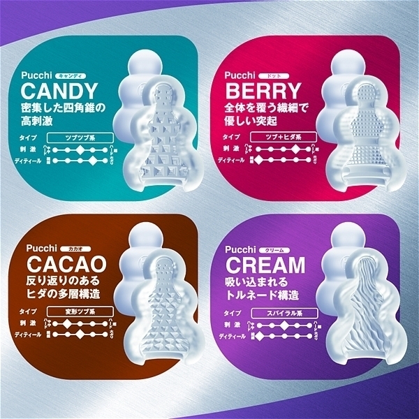 プラスウェッチは独自開発の新素材。水をつけて軽く擦ることで内部の超ミクロサイズで閉じ込められた「潤いゼリー」が水に反応し、沁みだし樹脂表面をねっとりと潤い包みこみます。<デコボコ感さらにクッキリ。>「HD(High Definition)成形」で突起のデコボコ感がさらにクッキリになりました。突起に触れたときの粒立ちが違います。<キャンディー内部構造>「密集した四角錐の高刺激」整然と敷き詰められた四角錘の突起<クリーム内部構造>「吸い込まれるトルネード構造」斜めに擦り上げてくるヒダはクリームのように昇りつめる絶頂感<ベリー内部構造>「全体を覆う繊細で優しい突起」フワフワとした起毛が包み込みまったりしたなめらかな触感<カカオ内部構造>「反り返りのあるヒダの多層構造」ビッシリ並んだヒダは反発しながら複雑に絡みつく刺激