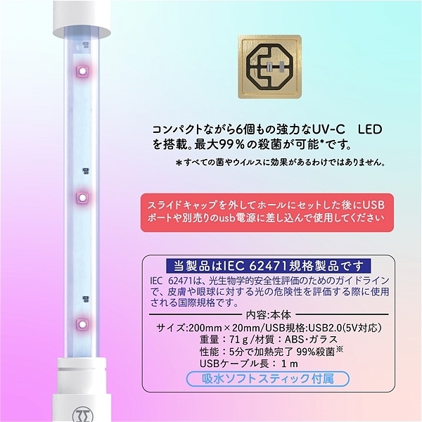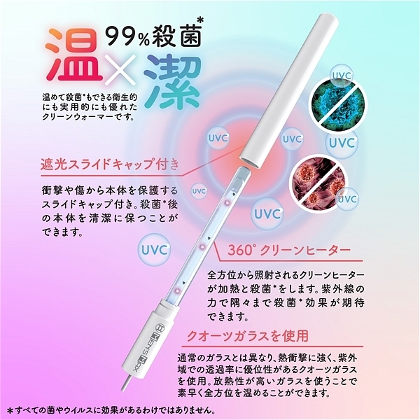 メンズマックス 360UVウォーマープロ。3分で急速加熱、UVランプで360°殺菌、20センチのロングサイズ、乾燥に便利な吸水ソフト、ティック付属、USBケーブル長さ1m。99.9%除菌、除菌に最も効果的な波長275nmのUVC紫外線ランプを6個搭載し、USB電源を入れるだけで99.9%除菌ができる。気になるウイルスや、細菌をしっかり除菌してくれて、お気に入りのホール内を360度清潔に保てます。■使い方手順@本体キャップを外すAウォーマーをホールにセットするBUSB電源をセットして加熱と、除菌を開始します<ロングサイズ>本体サイズは20cmで大型ホールの使用も安心です<液体に強い 生活防水仕様>材質はABS・ガラスなので安心の生活防水仕様。丸洗いができるので清潔に使用できます。<ウォーマー機能>加熱時間およそ5分で約55度まで上がり加熱完了。※USB部分は非防水です。