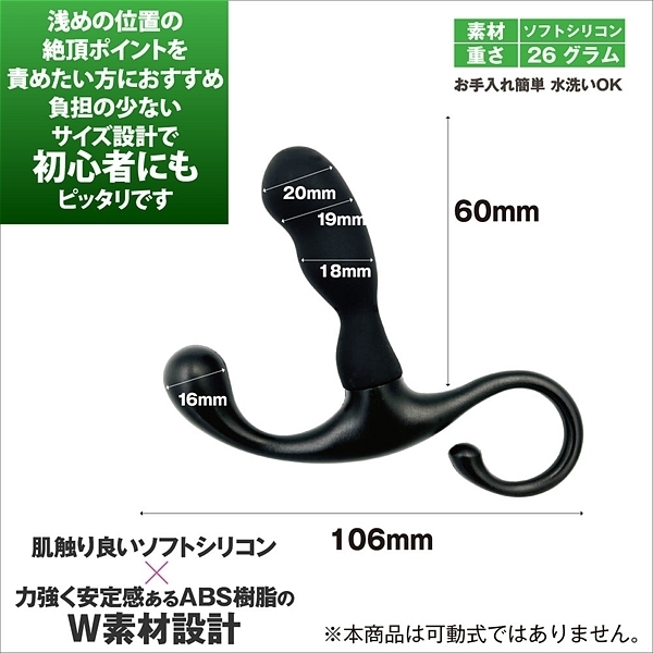 アナラーが生んだオリジナル設計エネマディルド。入口周辺や浅い部分を責めやすいショートサイズ。浅めの絶頂ポイントを責めるのに便利なショートサイズのエネマディルドです。先端が太くなっており、気持ちの良い部分をピンポイントに責められます。全長は短めなので、通常サイズでは長すぎて使いにくいという方にもピッタリ。幅は最大でも約20mmと負担の少ないサイズですので、初心者の入門用としてもおすすめです。持ち手部分は丈夫なABS樹脂、挿入部分は肌触りの良いソフトシリコン製で使い易さも抜群です。