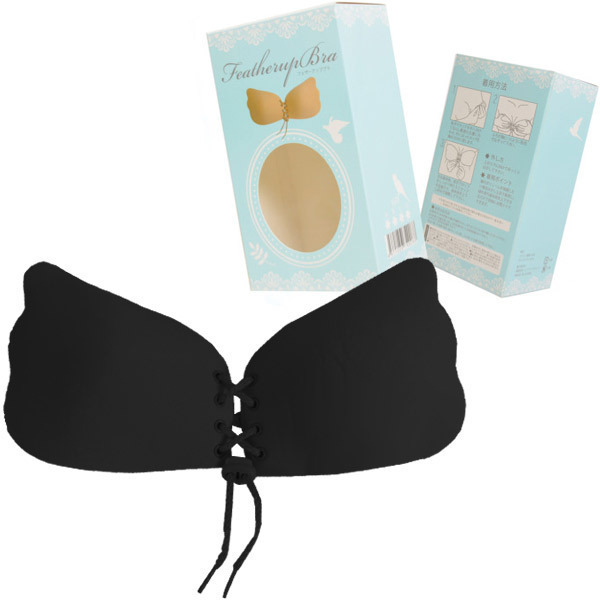 寄せて上げて谷間もメイク♪天使の羽型シリコンブラ「フェザーアップブラ ブラックB」。羽のようなカップがボディに馴染みやすいブラックカラーのモールドブラ!カップ内側は粘着シリコン樹脂、外側はサラリとした肌触りのポリエステル素材です。中央はアジャスターで自在に調整できる編み上げ仕様!胸のボリュームを強調したい場合は少し上目で着用し、紐を持って留め具を上下させるだけで自由に谷間をメイク出来ます。【着用方法】両手でカップを外に向けて反らし、最適な位置にあわせてから外に反ったカップを胸の方向に戻して、ふちが胸につくように指先でなぞって下さい。左右着用後、両手でカップをしっかり押さえて定着させ、留め具をスライドしてお好みで調整して下さい。粘着効果が薄れた際は、一度水洗いし乾燥させてから再度着用して下さい。※サイズは画像を参考にお選びください※通常よりワンサイズ小さめが綺麗に着用できる目安です※Aサイズ(h00036)もございます