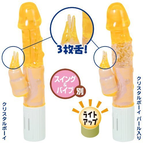 人間工学に基づいた昇天必須の快感バイブ「クリスタルボーイパール入り オレンジ」。本体内部に贅沢なパールを内蔵し、使用時にはその部分が怪しくライトアップ!カリの直径約3.8cmと巨根マニアの方も納得!子機も3枚舌仕様と抜かりなし!さらにスイングとバイブの個別動作が可能…と、見た目と性能どちらも兼ね備えた次世代バイブ!