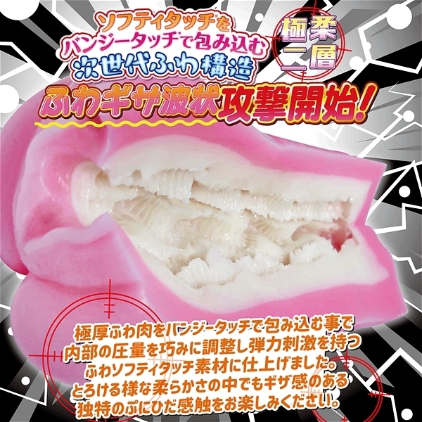 次世代ふわ構造で波状攻撃開始!!ふわふわのソフティタッチを柔らかバンジータッチで包み込む内部圧を適度に逃がして絶妙なふわとろ仕上げに完成ふわ素材特有の油分によるべとつき感も解消した進化した構造ですとろける様な柔らかさの中でギザ感のある独特のぷにひだ感触をお楽しみください揺らぐふわひだ、痺れるギザ感、溢れる幸福、極柔の気持ちよさを一度は体験を!逃げられない、このぷにふわ感