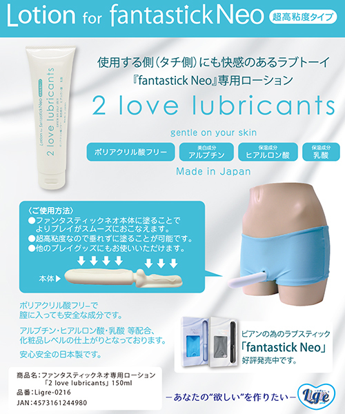 レズビアン専用の超高粘度タイプのローション「2 love lubricants 150ml」です。あの人気商品「ファンタスティックネオ専用ローションで、膣に入っても安全な化粧品レベルの安全性が特徴!チューブタイプなので適量を取り出しやすく、美白成分アルブチン、保湿成分ヒアルロン酸、乳酸が入った化粧品レベルの仕上がりとなっております♪歯磨き粉のような硬さ超高粘度!スティックに垂れる事なく塗る事ができて使いやすい♪ファンタスティックネオだけじゃなくバイブやローターなど他のグッズにもお使いいただけます。