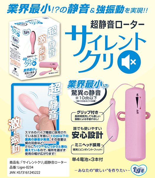 超静音のローターが登場!業界最小の静音!「サイレントクリ」です!スマホのバイブ機能にも採用されている加工を施し、10db以下の脅威の静音!10dbと言えば、蝶の羽ばたきぐらいの音と言う事は有名!まさに無音に近いローター!しかしパワーもしっかり兼ね揃えた素晴らしいローターなのです!ヘッドは握りやすい取っ手付きで、激しい振動で指がしびれる事もない!さらに小さめのヘッドでピンポイントへしっかりフィットして当てがう事が可能!小ぶりサイズで女性でも使いやすい安心設計!これなら自宅だろうが、どこだろうが誰にもバレずに静かにプレイが可能!サイレントクリでイキまくってください!
