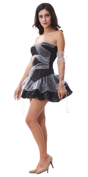 ゾンビメイクでミイラな花嫁に♪ハロウィンにぴったりなゾンビ系ウェディングドレスコスチューム。ダークなブラックカラーのベアトップワンピースに巻いたオーガンジーリボンでミイラの包帯をイメージ!腕にぐるりと巻きつけられるよう、単品リボンもセット。サテン素材のふんわりミニスカートで可愛らしさもしっかり備えたハロウィンコスプレ衣装です。※セット内容以外は付属しておりません。