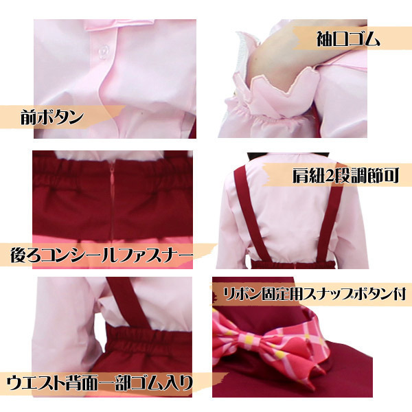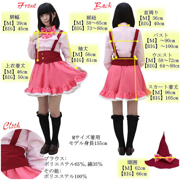 プリティでキュートな魔法つかいになりきり♪魔法学校の制服コスチュームセット。●花びら風の袖口が可愛いブラウス●パステルピンクのフリルタイ付き●裾フリルたっぷりの吊りスカート●ウエスト後ろゴム&ファスナー●金模様も忠実に再現したケープ●チェック柄リボン付きとんがり帽子●首元用のおそろい柄リボンもセット。帽子の内側にある模様までしっかりこだわって再現した豪華セットのなりきりコスチュームです。※水洗い不可、塩素系漂白剤による漂白不可、アイロンは中温で当て布使用、ドライクリーニング可、色落ちの可能性があります、ご注意ください。