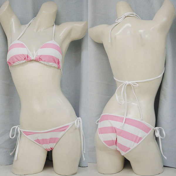 パステルカラーで萌え感たっぷり!ピンク×ホワイトのボーダー柄ビキニセットが登場しました。太めのしま模様がとってもラブリー!ホルターネックの三角ビキニはブラパット付き、ショーツのサイドリボンは取り外しが可能な紐パン仕様です。キュートなしましま水着でビーチやプールへGO!※水洗い可、塩素系漂白剤による漂白不可、アイロンは中温で当て布使用、ドライクリーニング可※こちらの商品は在庫の状況によりお届けまでに4日〜7日程度かかる場合がございます。