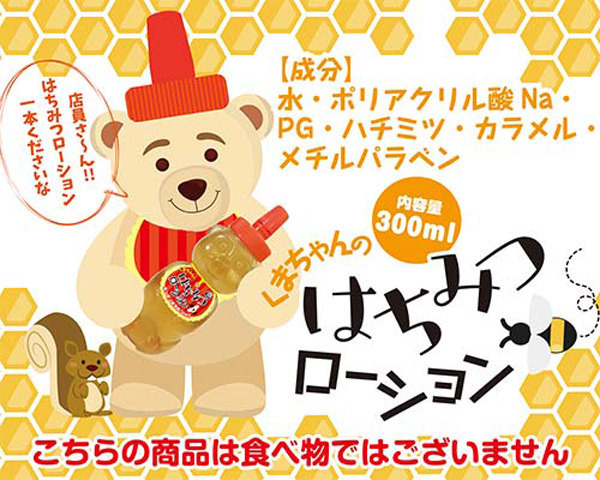 キュートなクマちゃんボトル入り♪本物のはちみつを配合した香り付きローション「くまちゃんのはちみつローション」。●あま〜い香りのハチミツを配合●本物のようなとろとろテクスチャ●頭のキャップを回して開閉可能●内容量300ml入り。まるで本物!?ハチミツみたいなトロトロ感が楽しめるクマ型ボトル入りローション。オナニーに、カップルのラブタイムに、あま〜いひと時をどうぞ。【成分】水、ポリアクリル酸Na、PG、ハチミツ、カラメル、メチルパラベン。※食べ物ではございません。