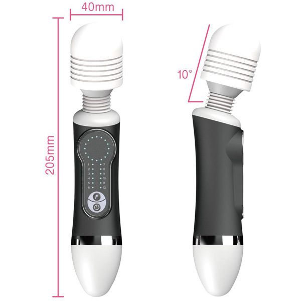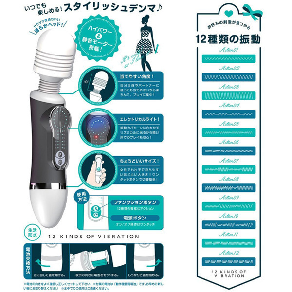 女性に嬉しい思いやり満載♪ポップにプレイを楽しめるコンパクト電マ。●黒×白のスタイリッシュなカラー●全長20cmほどの使いやすいサイズ●ヘッド部分は当てやすく10度傾斜●電源ON/OFFともにワンタッチ操作●Fボタンで12種類パターン切り替え●振動と連動する鮮やかライト機能●メンテナンスしやすい生活防水。1人でもラクラク操作できるカーブヘッド×操作しやすい小さめサイズ×暗い所でも使えるイルミネーション機能!満足必至な機能をたっぷり詰め込んだ優秀電マ。マッサージャーデビューにはもちろん、アレコレこだわる欲張りレディにオススメです。