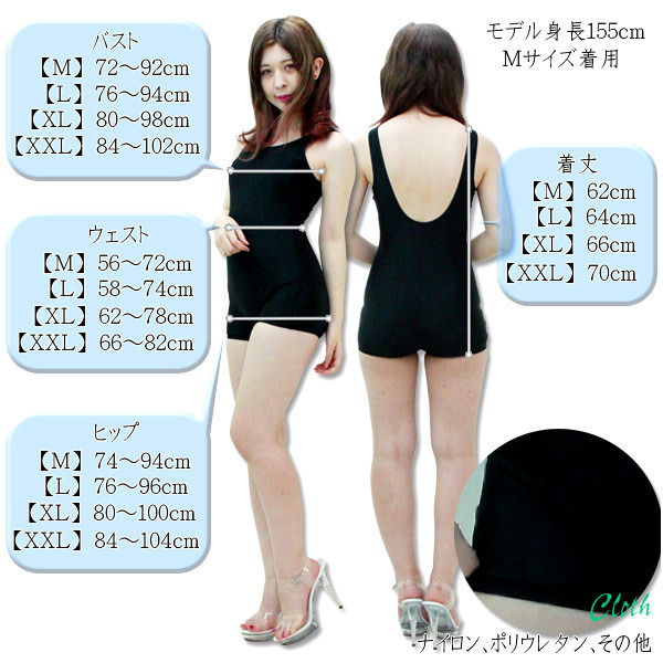 XLサイズ:B80〜98cm・W62〜78cm・H80〜100cm 着丈66cm セット内容:水着単品(前身頃全面に裏地付き、胸部にパット付き) 素材:ナイロン、ポリウレタン、その他