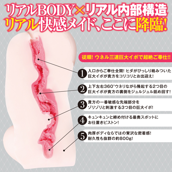 ずっしり肉厚!重量約800g!極上ダイナマイトBODYのご奉仕メイドが降臨!!巨乳メイドが完全従順!何でも言うことを聞いてくれる従順過ぎるメイドちゃんの中は、ウネル三連巨大イボで超絶ご奉仕してくれます!ぷにコリ超リアル挿入感を楽しんでね!最高の揉み心地のふわふわおっぱいもお気に召すままモミモミしてくださいませ!直接肌に触れるものだから安全性と感触にこだわった高品質なエラストマーを使用しています。