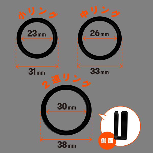 しっかり固定して外れにくい!高品質シリコンの弾力性に優れたペニスリング。ベタつきのないサラスベ質感で着け心地抜群!一つだけ使うも良し同時装着もOK♪皮戻り防止や持続力アップなどシチュエーションに合わせてお使いください。内径23mmの小サイズ、26mmの中サイズ、30mmの2連リング、そして自分の身体に合わせてサイズ変更できる内径調整リングの4個付属。
