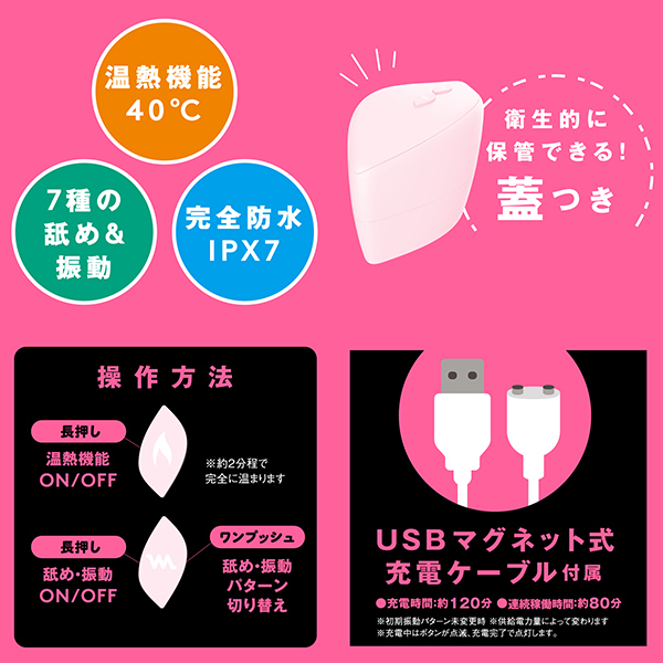 アツくて甘〜い愛のご奉仕クンニ_超!愛を感じる舐めローター!彼の熱い舌を思い出す温感機能は40℃まで温まる人肌温度_先っぽで刺激するチロチロクンニからグイグイ舐め上げる激しいクンニまで多彩なクンニが楽しめちゃう_さらに7パターンの振動機能付き!震えるあったかベロでとろける濃密前戯_やっぱりクンニがナンバー1!!!完全防水なので使用後のお手入れもラクチン♪敏感な部分に直接使うものだから、優しい肌あたりの高品質ソフトシリコンを使用しました。衛生的に保管できる蓋付きです。振動・舌舐め:7パターン&完全防水IPX7等級&充電用USBケーブル付属。カラー:ピンク