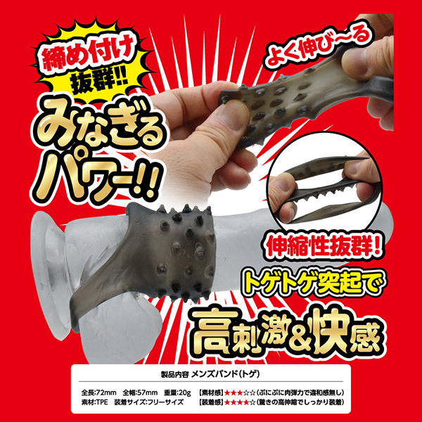 夜もがんばリングで大人気のやわらかメンズリング「ち●こリング」シリーズにスーパーなバンドが新登場!今度のち●こバンドは「ベースに装着するメンズバンド」!ぷにぷにっとした柔らかなTPE(エラストマー)素材は、ぐい〜んとよく伸びる高伸縮性!サイズ問わずでどんな大きさでもしっかりフィットの抜群の装着感&締付感!さらに、ツンツンとしたトゲトゲ突起による高刺激快感が!男らしさを引き立たせるスモークカラー!ほとばしるストロング、みなぎるパワー!