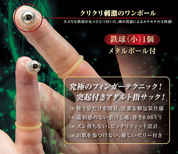 普通の指挿入だけでは物足りない!そういうときに役立つのが「フィンガースキンDX (G−6)」。コリコリとした刺激が味わえるメタルボールが指先についたラブグッズ版の指サック!コリコリ、トントンとこれまでの指挿入では味わえない刺激が楽しめるほか、Gスポットやアナルに挿入して前立腺を刺激するなど男女兼用でお楽しみ頂けます♪鉄球はしっかり台座に固定されているので簡単に外れるような心配は不要!使うことで心地良い異物感が味わえるので細めのローターやディルドに被せて使うのも◎。表面にはゼリーが塗布されていて挿入しやすく衛生的♪気持ちいいところをピンポイントで刺激するのに最適です!