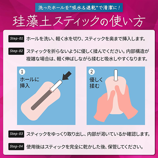 オナホのメンテナンスに最適!オナホを洗った後に乾くまでに時間がかかり衛生的に不安だと感じる人も多いですが、洗浄後に珪藻土スティックを挿し込み揉み揉みするだけで簡単に水分を吸収し清潔に保てます♪使用後の珪藻土スティックは十分に乾かしてから保管してください。他にも靴に入れて消臭・除湿、タンスや押し入れに入れて防カビ・調湿にも使えます。