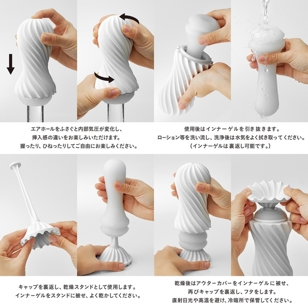 回って吸いつき絡みつく新快感!スタイリッシュなケース入りの「TENGA MOOVA(テンガ ムーバ)」ソフトタイプが登場。●SILKY WHITE(シルキーホワイト)。●ツイスト状の軟質素材ケース。●握ったり捻ったりと変形自在。●ケース底にエアホールを配置。●バキューム力でケースが回転。●ソフト仕様のインナーホール。●ニオイやベタつきのない素材。●繊細ヒダ&吸盤イボの快感構造。●インナーは取り出して洗浄可。●繰り返して使用可能(約50回)。まるで現代アートのオブジェのように美しい独特フォルムがテンガらしい新次元のTENGA MOOVA。ツイスト状ケース底面の空気穴を塞ぐと、内部気圧が変化しバキュームが発生!その状態でピストンすると連動してケースが回転するという斬新ギミックを搭載!さらに、雑巾を絞るように直接ケースを捻れば、絡みつくような摩擦刺激も体感できます。革新的な快感と美しさ、さらに利便性も高いTENGAをお楽しみ下さい。TENGAの使い捨てオナホール、ディープスロートカップ(r06455)や黒テンガのフリップホールブラック(r03378)もどうぞ!