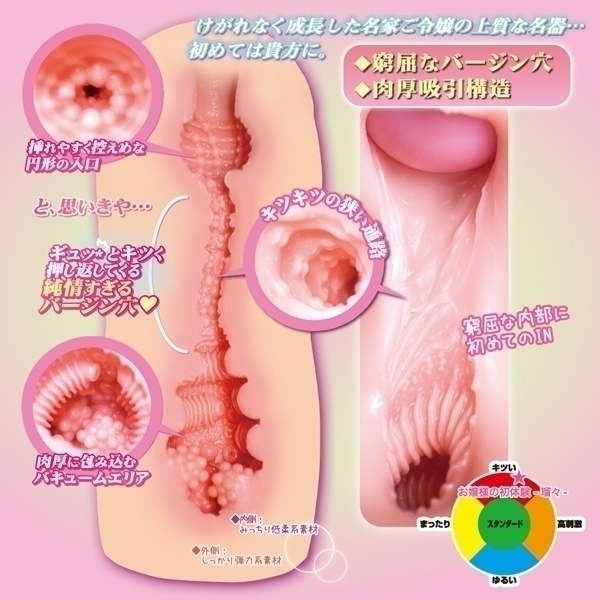 汚れなく成長したお嬢様の名器、初めては貴方に。内側はみっちり低柔軟系素材で外側はしっかり弾力系素材を使用したハイブリッド2層構造。窮屈なバージン穴、肉厚吸引構造。