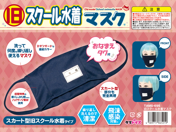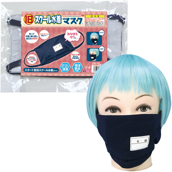 スカート部分まで完全再現!洗って繰り返し使える人気の旧型スク水風に仕立てたネイビーカラーのユニークマスク。旧型ならではの厚みのある丈夫なハイゲージ素材を採用♪口元には学年とクラス、名前が入れられるゼッケン付きの本格派仕様です。感染対策用として使えるほか、コスプレイベント、ハロウィン仮装の小道具としても最適です♪●メーカー型番:TAMS-695