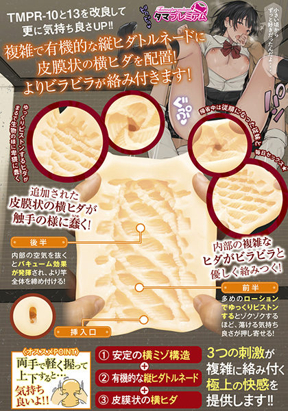 タマプレミアム18弾!3種の刺激が複雑に絡みつく410gの非貫通オナホ。触手の様なヒダが蠢き絡みつき、蕩ける気持ちよさが押し寄せる!空気を抜けば密着力UP、強力バキュームを体感できます。横ミゾ×縦ヒダスパイラル×皮膜状の横ヒダ構造が極上の快感を生み出す!まったり楽しめる高弾力&高伸縮素材の日本製オナホ。パケ絵は「楝蛙(おうちかえる)」氏◎ローション付●メーカー型番:TMPR-018