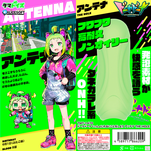 <ALICE SOFT(アリスソフト)とタマトイズのコラボ商品>高耐久&ノンオイリーな新開発素材、発砲シリコンを採用!刺激、締め付け、バキューム感全てが絶妙なバランスで仕上がった非貫通オナホ。エロゲブランドALICESOFT最新作「ドーナドーナ いっしょにわるいことをしよう」から、電気工学に精通した天才アンテナを再現♪擦るような連続刺激で快感を誘います。シリーズは全6種展開●メーカー型番:TMT-1470