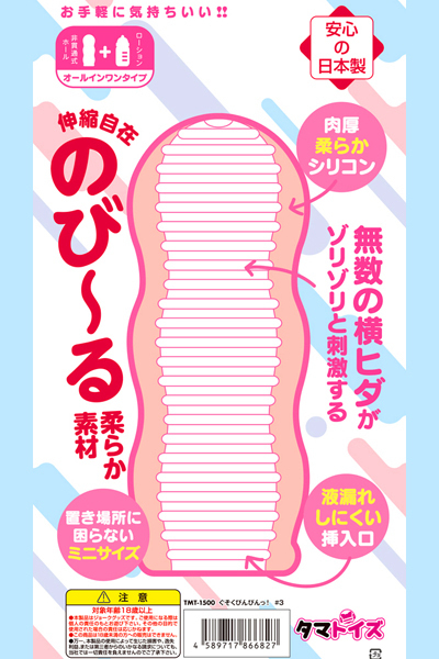 どんな時でもすぐ使える、携帯タイプの非貫通オナホール♪肉厚柔らかシリコン使用!横ヒダタイプで無数の横ヒダがゾリゾリと刺激!伸縮自在の、のび〜る柔らか素材なのに、液漏れしにくい挿入口!舐めても安心・安全な日本製のローション付きのオールインワンオナホ。●メーカー型番:TMT-1500