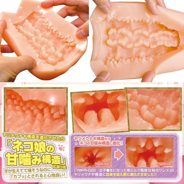 弾ける快感!凶悪な見た目とは裏腹に使ってみると気持ちいい非貫通オナホ「ネコ娘プリティーエッチ」です。上部のトゲトゲ構造と下部のフリック構造で挟み込む!素材はフレキシブルスキンを使用したことで、高弾力で高伸縮性を実現♪オナホ特有の匂いを抑え、グリップ感の良い仕上がりとなっています。内部構造は派手目のギミックで、上部には猫の歯をモチーフにした山型の突起群をびっしりと配置!底部には小さな舌のような突起を2列配置し、上下でそれぞれ異なる刺激がお楽しみ頂けます♪●メーカー型番:TMPR-033