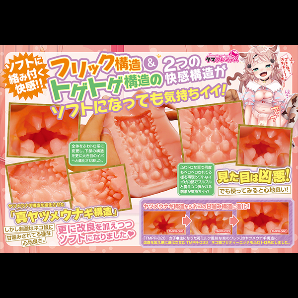 大小山型の突起がさわさわと竿を撫でるゾクゾク感がたまらない!高刺激と思わせながらも心地よい刺激でイカせてくれる非貫通オナホ「ネコ娘プリティーエッチソフト」です♪ネコ娘の甘噛みをコンセプトに開発されたオナホで、タマトイズで人気のヤツメウナギ構造を進化させ、フワトロ系にしたことで大きめのイボのような刺激を実現!アウターはシンプルな筒型で挿入口はポチ穴♪フレキシブルな弾力感のある素材感でサイズ的にミドルサイズ!弾かれるようなフリック構造の内部とびっしり配置された2種類の突起イボが、絡みつくような快感を存分に味わわせてくれます♪●メーカー型番:TMPR-040