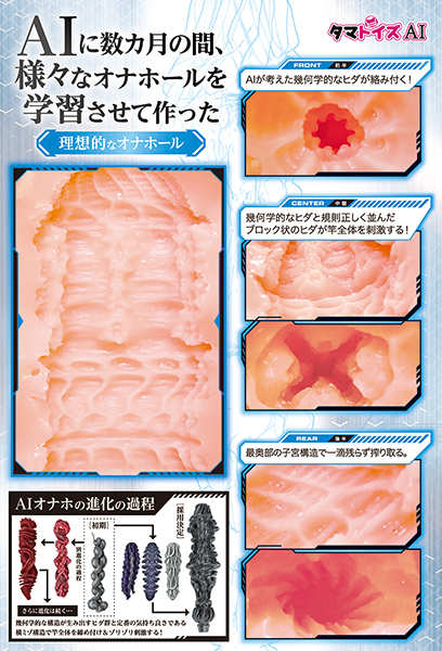 日本国内の自社工場で生産された、AIが考えた理想のオナホールと理想の女性をパッケージ化した非貫通オナホです♪柔らかすぎず、硬すぎない少し弾力のある素材が使用されていて、全体を締め付ける幾何学的な構造がゾリゾリとした刺激を生み出します。AIが考えた幾何学的なヒダが絡みつく内部構造には規則正しく並んだブロック状のヒダも備わっていて、最奥部には子宮構造もあり一滴残らずあなたの精を搾り取ります!匂いも控えめで弾力のあるフレキシブルスキンを使用!適度な粗さが引っ掻く感触を抑え、粘膜感のある刺激が不思議な気持ちよさを味わわせてくれます♪高弾力・高伸縮素材でヒダメイン!パッケージイラストも内部構造もAIが考えて作られています。●メーカー型番:TMAI-01