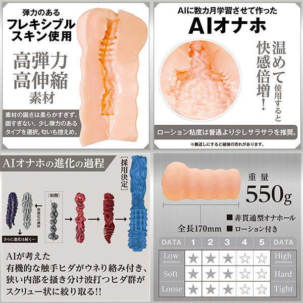 AIに数カ月の間、様々なオナホールを学習させて作った理想的なオナホール。前半:人工AIが考えた触手ヒダがウネり絡み付く!中盤:狭い内部を掻き分け竿全体を包み込む快感が押し寄せる!後半:波打つヒダ群が絡みつきスクリュー状に搾り取る。●非貫通型オナホール●弾力のあるフレキシブルスキン使用●高弾力・高伸縮素材匂い控えめローション付き●日本製●国内自社工場製