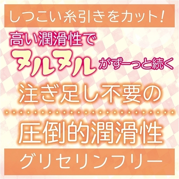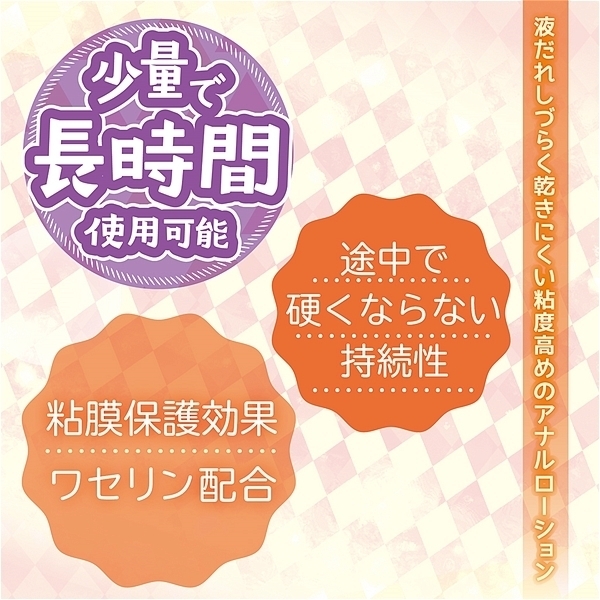 粘膜保護効果ワセリン配合、グリセリンフリー。粘度高めのアナルローション。しつこい糸引きをカット!液だれしづらく乾きにくい。JAPAN QUALITY途中で硬くならない持続性、注ぎ足し不要の圧倒的潤滑性、高い潤滑性でヌルヌルがずーっと続く、少量で長時間使用可能!
