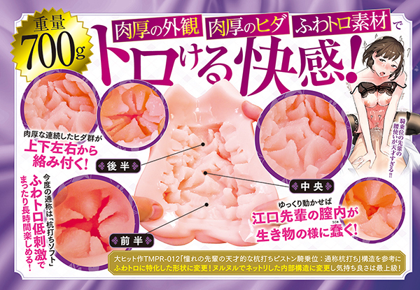 「憧れの先輩の天才的な杭打ちピストン騎乗位」構造をふわトロに特化した形状に変更!肉厚な外観に肉厚なヒダ、ふわトロのトロける感覚。フレキシブルソフトスキン、高軟力・高伸縮素材で匂い控えめ。※パッケージが新しい仕様に変更されている場合があります。