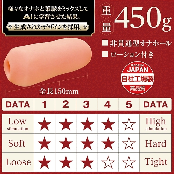 AIに数カ月の間、様々なオナホールを学習させて作った理想的なオナホール様々なオナホと葉脈をミックスしてAIに学習させた結果、生成されたデザインを採用。「AIが考えた内部構造」+ふわ柔素材が奏でる心地よさ。弾力のあるフレキシブルスキン使用高弾力・高伸縮素材で匂い控えめ安心の日本製※裏返しにすると破損の恐れがあります。●メーカー型番:TMAIー05