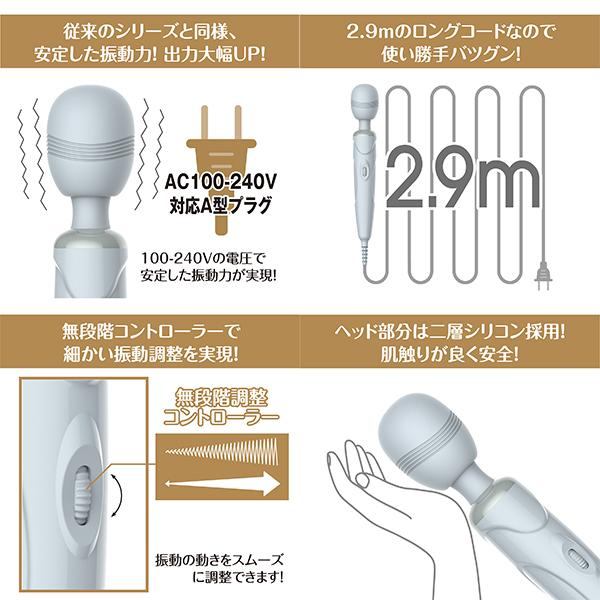 2016年発売より売上を伸ばし続けている極天。発売7年目を記念し、快感を極め女性の声を生かした電マのハイエンド商品をご用意しました。2.9mのロングタイプコードで、電池切れの心配も無く、強烈振動・従来商品以上のハイパワー振動をお楽しみ頂けます。振動強度を自在に操るダイヤル式で、微細振動から貫くような激震動まで無段階に制御可能です。・パワフルACアダプター使用・無段階調節コントローラー・静音・二層シリコン採用・強烈振動・自在に曲がるネック部分・2.9mのロングタイプコード・安心、安全の世界標準設計 <本体仕様電圧>AC100−240V対応プラグ