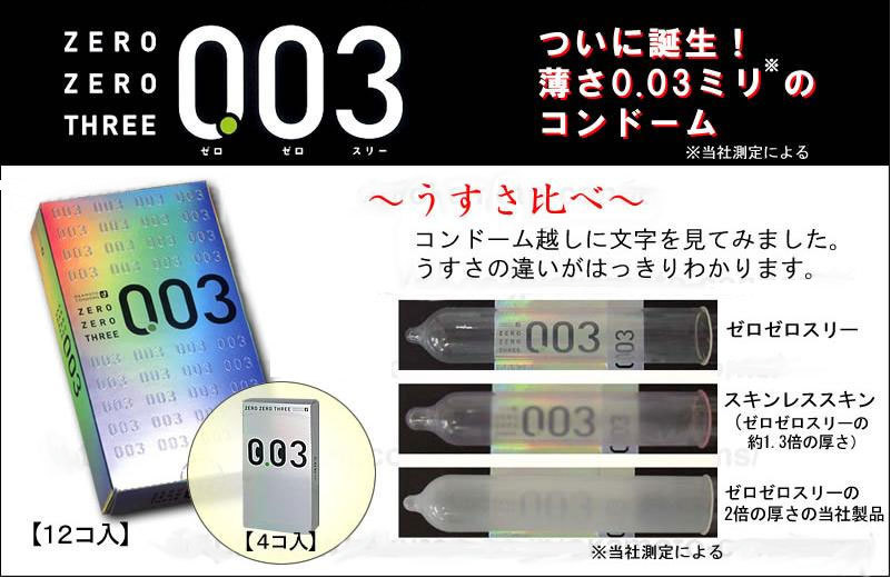 オカモト社の極うすコンドーム「ゼロゼロスリー」レギュラータイプ(12個入)。●先端から根元まで均一なうすさ0.03mm●ゴム臭カットの天然ラテックス製●素肌感覚のナチュラルカラー●しっとり滑らかジェルを塗布。高い伸縮性で驚異的なフィット感を誇る、オカモト社の大人気コンドーム!ぬくもり伝わる超至近距離恋愛を、ぜひ体感して下さい。