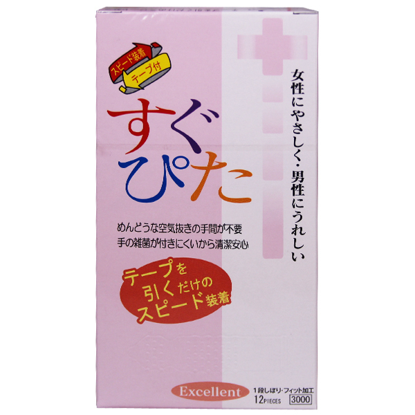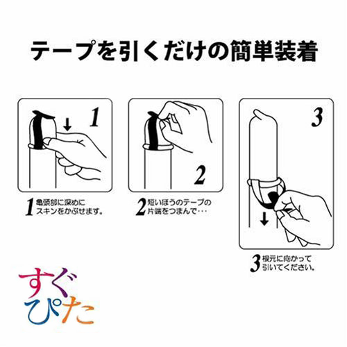 一度使ったらやめられない!テープを引くだけで簡単に装着できる、スピード装着テープ付きコンドーム「すぐぴた3000」12個入。空気がうまく抜けなくて何度も装着してるうちに一個無駄にしてしまった、爪がうっかり当たって使用する前から破けてしまった、そんな経験はありませんか?「すぐぴた3000」なら、そんなお手間は取らせません。特殊一段緊縮絞りが脱落防止に効く、ツブ突起付きコンドームです。