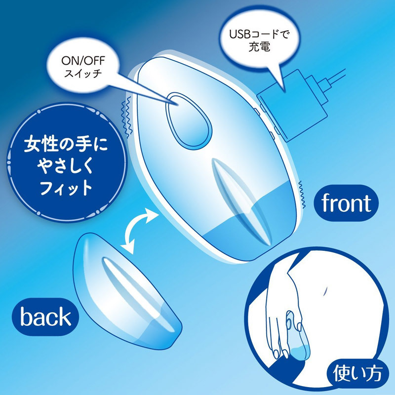 ナチュラルな姿勢でラクに使えちゃう♪爽やかなパステルブルーのジェクス製ローター。●パソコンのマウスのようなフォルム●自然と手になじむコンパクトサイズ●利き手不問のセンタースイッチ●USB充電式●ON/OFF切り替えのみの簡単操作。リラックスした体勢でも手にしっくりと収まってくれるマウス型!広い接地面が深い振動を的確に伝えてくれる、オシャレで可愛いハンディローターです。