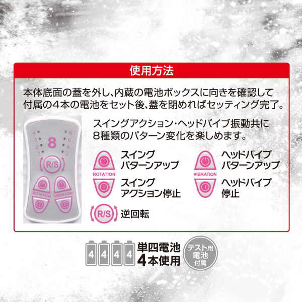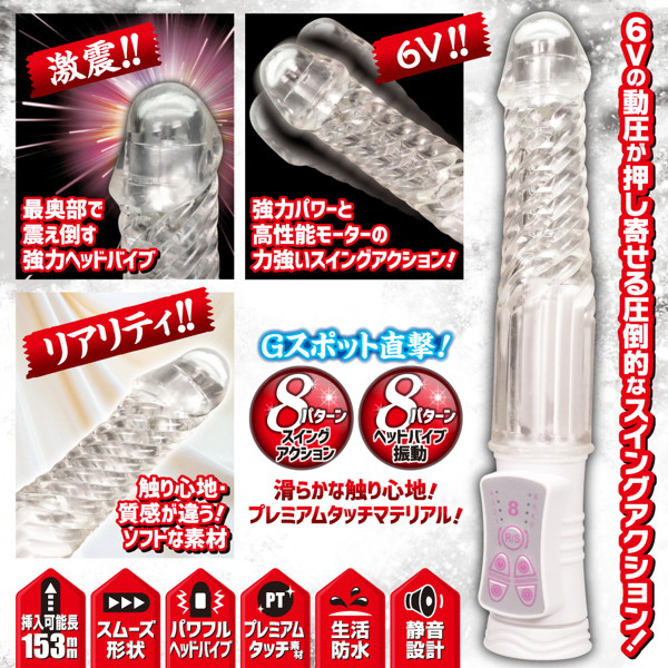 6Vの激震がGスポ直撃!中イキ派唸る悶絶必至の電池式バイブ(白)。内蔵された高性能モーターが繰り出すハイパワー振動!8種類のスイングと振動パターンに加えて、刺激の変化をもたらすリバース機能で飽きの来ない多彩なアクションが楽しめる♪挿入可能長は153mm、滑らかで触り心地の良いプレミアムタッチ採用!最奥を徹底的に責め立てるストレートバイブ。単4電池×4本使用