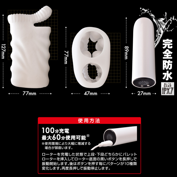 貫通型 パッケージ:18.3×13.8×4.7cm 本体:ホール(7.7×4.7×12.7cm・ローター(8.9×2.7cm) 重量:233g USB充電式