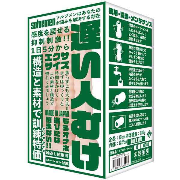ソルブメンはあなたのお悩みを解決する存在です。「遅い人向けエクササイズ」は常日頃から自分の遅さに悩む方に向けた提案型お悩み解決ホール。普通のホールでは注目されにくく専用グッズが開発されにくい分野ですが、ソルブメンのエクササイズホールなら毎日楽しみながら新しい自分へと前進する事ができるでしょう。遠い昔の感度に再会できる喜びを知ったらもう普通のホールには戻れません。あなたはオナホ選びに悩む必要はなくなります。あなたのためにソルブメンがいるのです。安心安全の日本製で繰り返し何度でも利用が可能です。週に3〜4回はエクササイズにチャレンジしてくださいね!