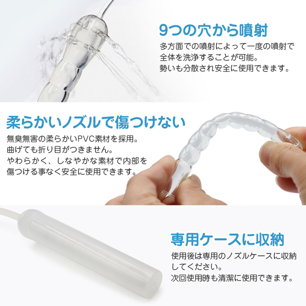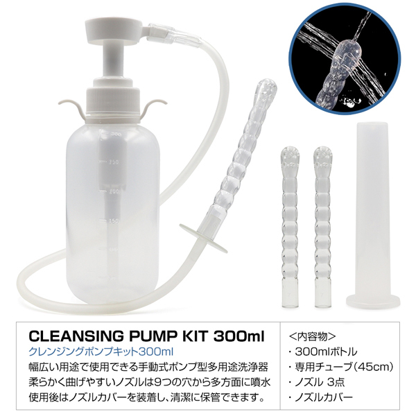 オナホをいつでも清潔に!幅広い用途で使用できる!手動式ポンプ型多用途洗浄器。9つの穴から多方面に噴射!多方面での噴射によって一度の噴射で全体を洗浄することが可能。勢いも分散され安全にやさしく洗浄できます。ノズルは無臭無害の柔らかいPVC素材を採用。やわらかく、しなやかな素材で内部を傷つける事なく安全に使用できます。45cmのチューブが使い勝手抜群。オナホールの洗浄だけでなくプレイ前後の洗浄、注入プレイ等幅広く使用できるマルチポンプキットです。使用後はノズルカバーを装着し清潔に保管できます。