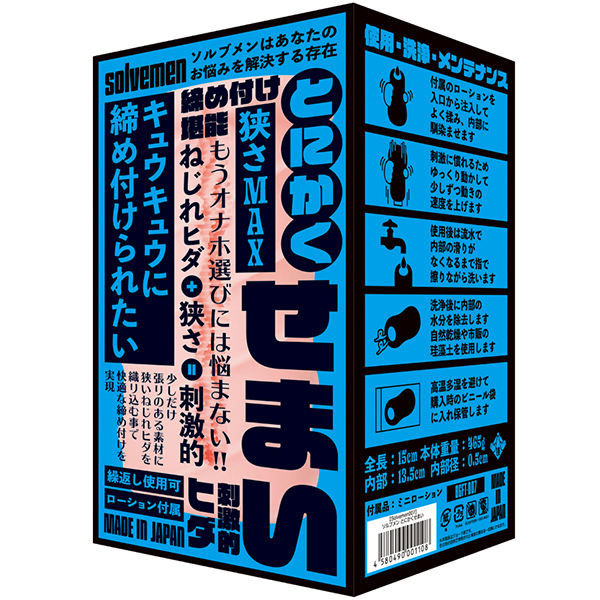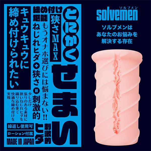 まったりとしたテイストでナカが広めな構造が好きな方のための非貫通型オナホ「とにかくせまい」です。捻れたヒダ構造が特徴のホールで弾力性が高く、ハリがある素材に非貫通らしいきつきつキュウキュウとした挿れ心地を実現!硬すぎず柔らかすぎずでしっかりとした締め付けも味わえる絶妙なバランスの仕上がり♪ねじれヒダと狭さ、これらの刺激が織りなすソルブメンのコンセプト型ホールだから毎日を新鮮な気分でお楽しみ頂けます。素材は安心安全の日本製!繰り返し何度でもご使用頂けます♪