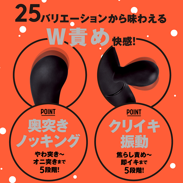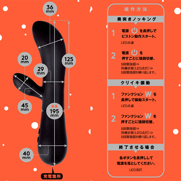 やわ突きからガン突きまで5段階のピストン刺激が楽しめるリニアタイプのピストンバイブです。ドドドドッと揺さぶる前後運動にぐいぐい刺激する奥突きノッキング!ローターは敏感部分を焦らしながら責めあげ、クリもしっかりと振動刺激するスグレモノ♪バイブの表面はシリコンコーティングされた肌触りの良いマットな感触でバイブ初心者の方でも十分挿入可能なサイズ感。ピストンは5段階、クリバイブの振動も5段階、焦らしから即イキまで計25通りのバリエーションから味わえるダブル責めの快感で満足必至♪電源はマグネット端子のUSB充電式でフル充電210分で連続稼働時間は約30分です。防水はIPX5等級なので浸水は厳禁です。水洗いは挿入部分やクリバイブまでにしておくのをおすすめします。
