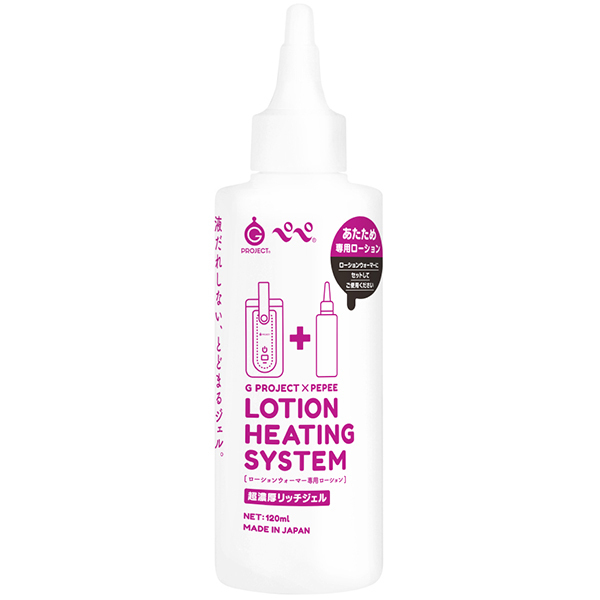 液だれしない、とどまるジェル。G PROJECT×PEPEEによるLOTION HEATING SYSTEM ローションウォーマー(v02705)で温める専用ローション!より温かく感じるように独自に開発しました!まとわりつく感触が心地いい超濃厚ジェルタイプ。片手で簡単!ひねって出せるスライド式キャップを使用しています。直接肌に触れるものだから、安心の国内生産&国産素材。※常温でのご使用も可能です。