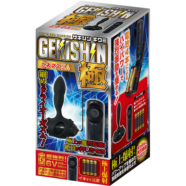 激震が走る快感!振動を極めた絶頂メンズローター!一般的なローターと異なる、電池四本駆動による6Vパワーの超強烈振動を実現させた「GEKISHIN 極」シリーズより、エネマボディを搭載したメンズローターが新登場!エネマボディは、さわり心地抜群のシリコン素材。ボディのラインは二箇所のくびれがアクセントを生みますカーブデザイン。超強烈振動がボディてっぺんまでビリビリ震える悶絶特殊構造です!「エネマスリム」はボディ直径10ミリ〜25ミリの細めなスリム仕様。この細さがアナタを虜にさせるはず!さらに、ハイパワーを加速させるアルカリ電池付き!パワーアップを極めた激震刺激を体感せよ!